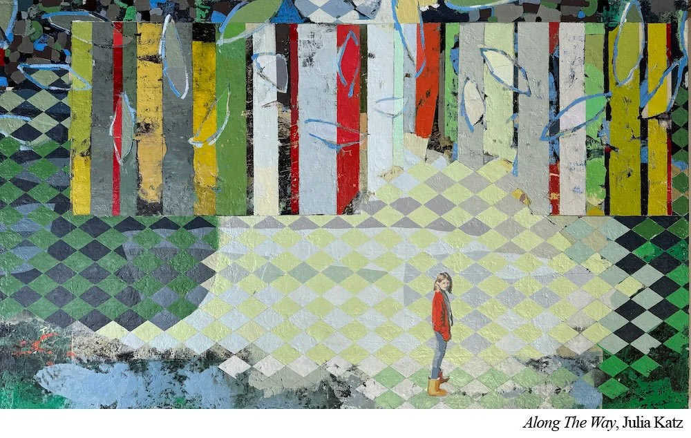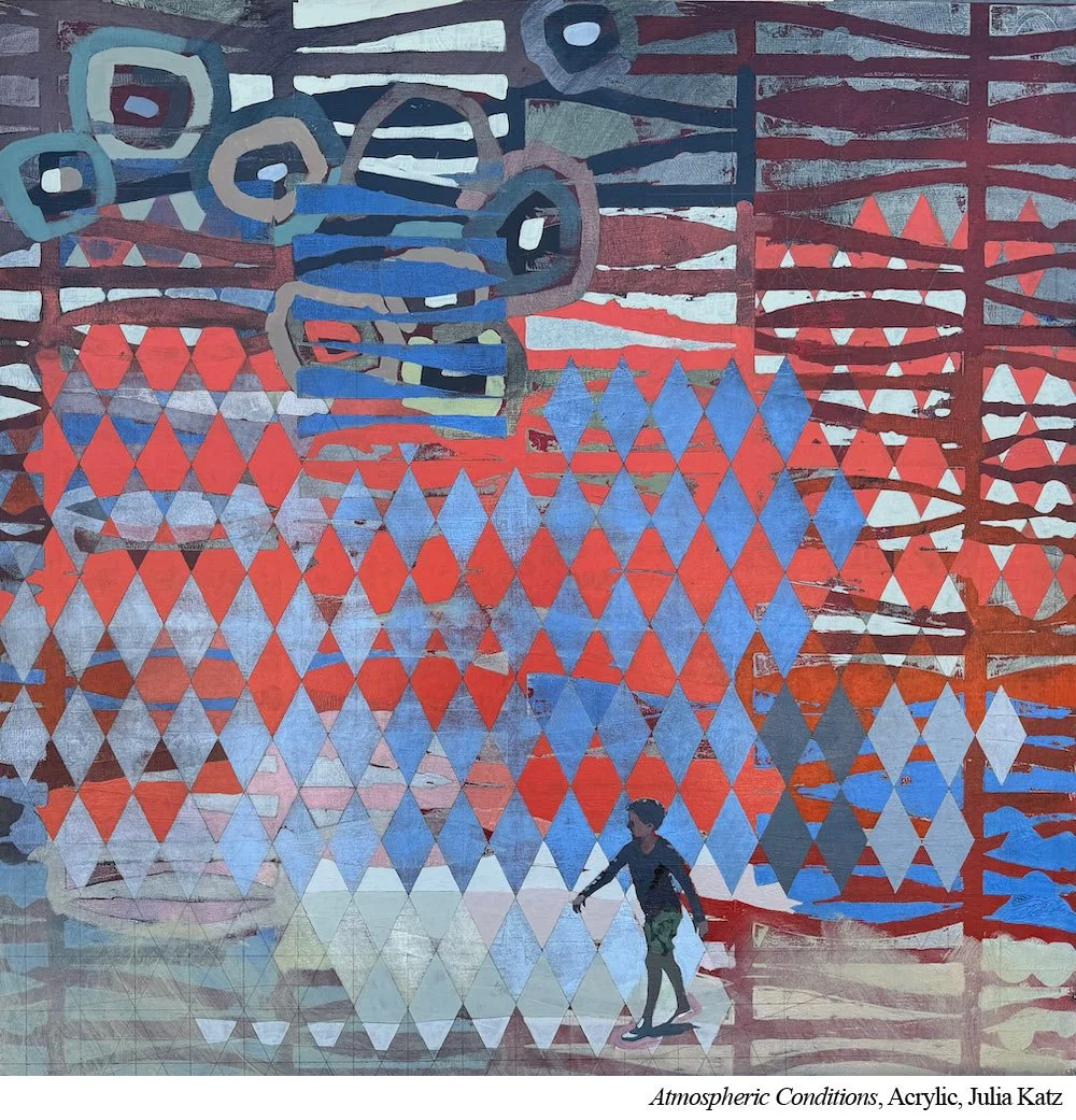 Katz knows the eye gravitates toward contrast—especially when a realistic figure appears inside a sea of abstraction. To balance this, she doesn’t dull her figures; instead, she builds contrast into other areas of the painting too. Strategic pattern choices and shifts in value keep the visual energy moving and stop any one part from overpowering the rest.