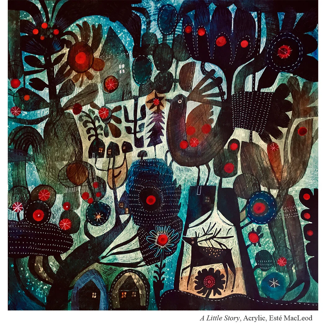 Esté MacLeod’s paintings are informed by the real and the imaginary. Her background in textile and ceramic design is noticeable in the stylised, abundant and colourful forms used in still life, landscape and floral paintings.