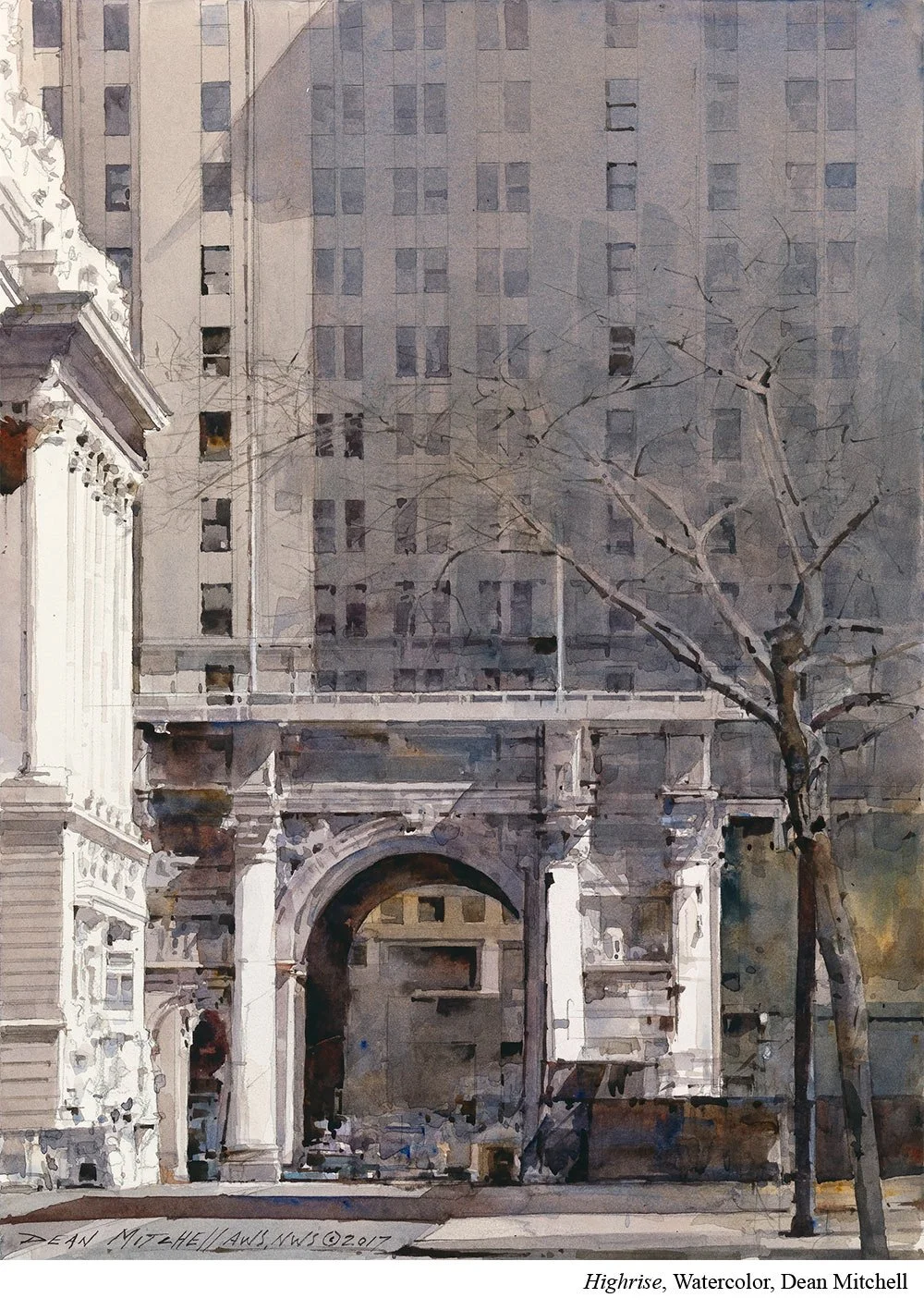 Mitchell’s watercolor approach is physical and intuitive. He’s not trying to control every molecule of water. He’s letting the medium move, then responding.